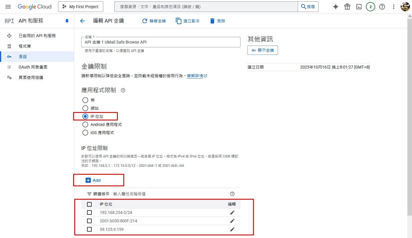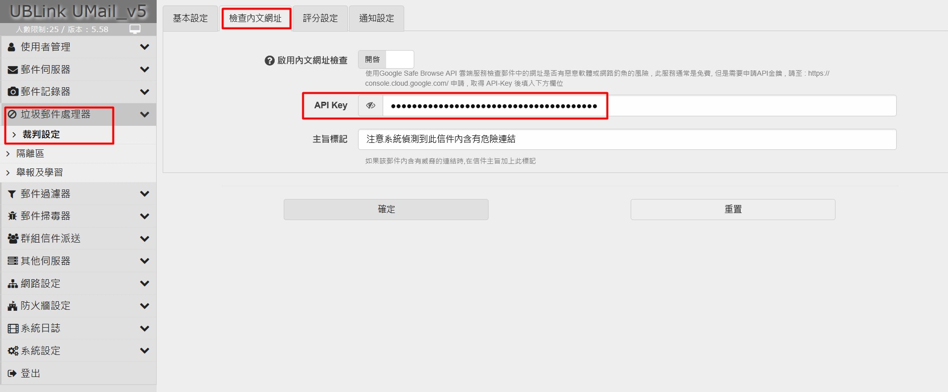 使用 Google Safe Browse API 雲端服務檢查郵件中的網址是否有惡意軟體或網路釣魚的風險 , 此服務通常是免費, 但是需要申請API金鑰 , 請至 : https://console.cloud.google.com/ 申請 , 取得 API-Key 後填入下方欄位