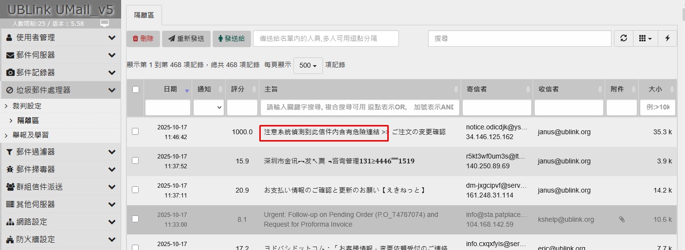 如果該郵件內含有威脅的連結時,在信件主旨加上此標記