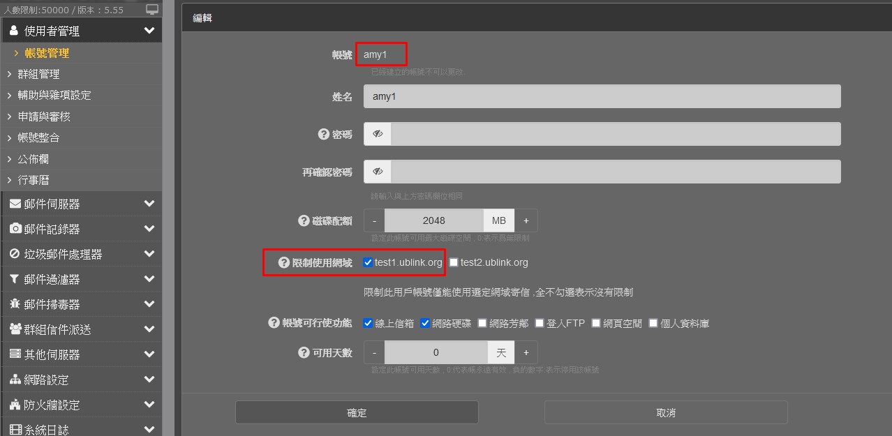 建立 amy1 限制使用網域 test1.ublink.org