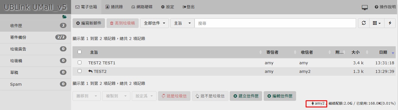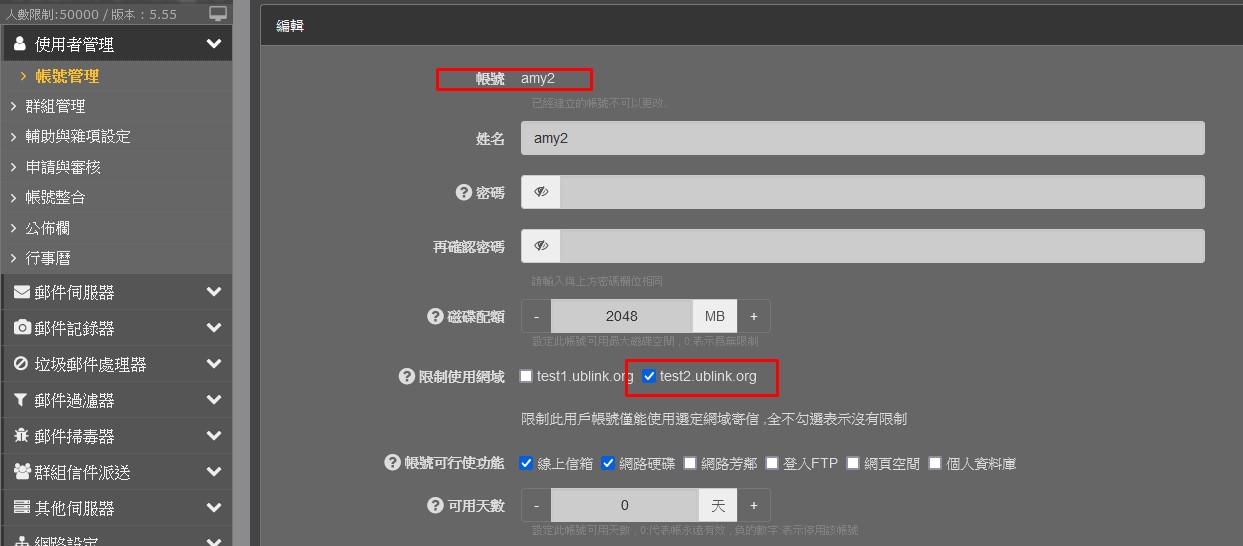建立 amy2 限制使用網域 test2.ublink.org