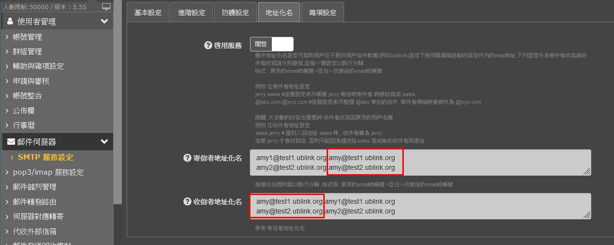 郵件地址化名設定可幫助用戶在不更改用戶信件軟體(例如outlook)設定下由伺服器端自動改寫信件內的emai地址,下列設定分為寄件者改寫與收件者改寫請分別書寫,並每一個設定以跳行分開