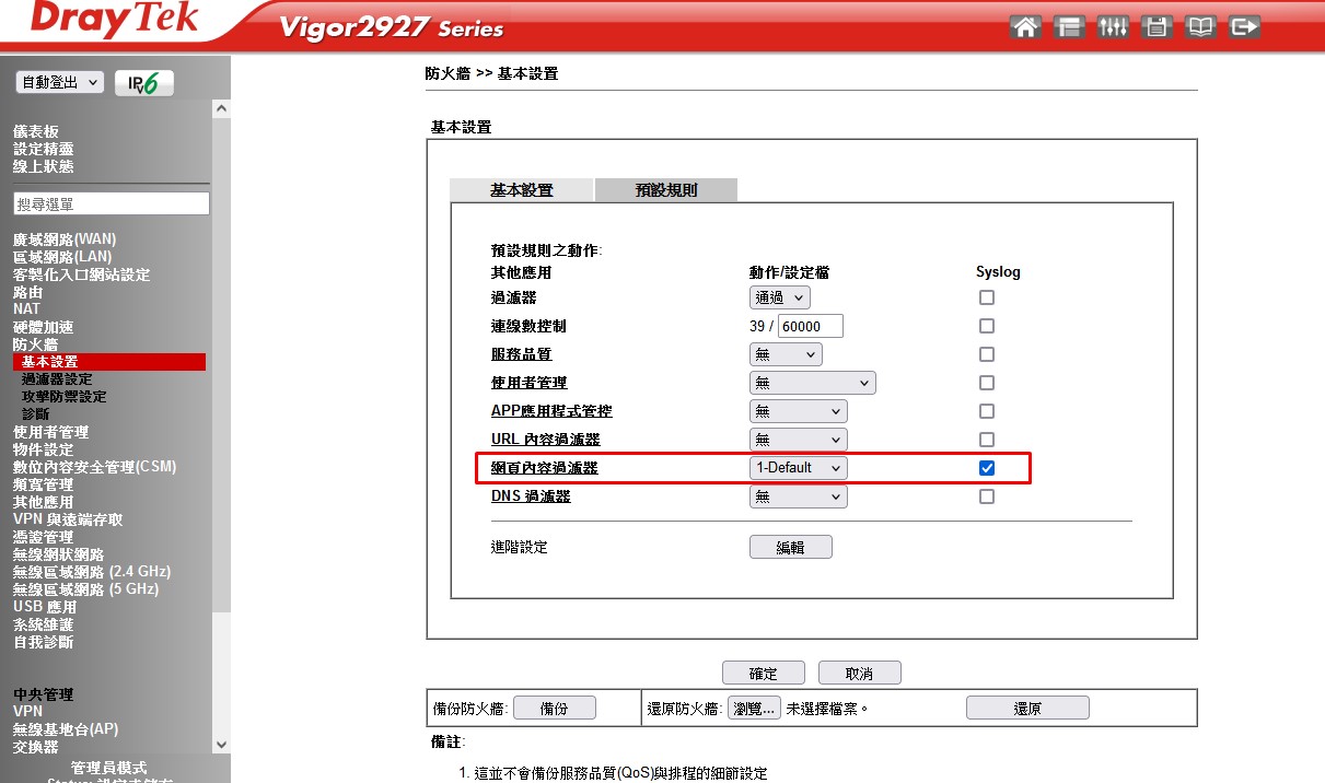 Vigor 防火牆 過濾器 的基本設置 預設規則