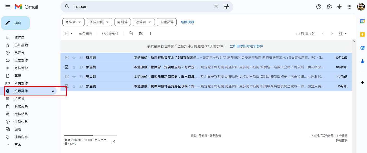 垃圾郵件 信件夾 資料匣 中 可以看見被歸類為 Spam 廣告信 垃圾信 的信件