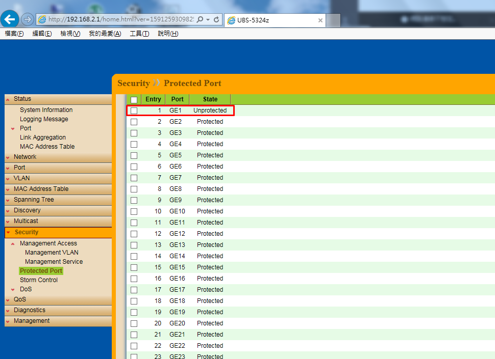 UBS-5324z Protected Port 隔離網路主機 Port isolation