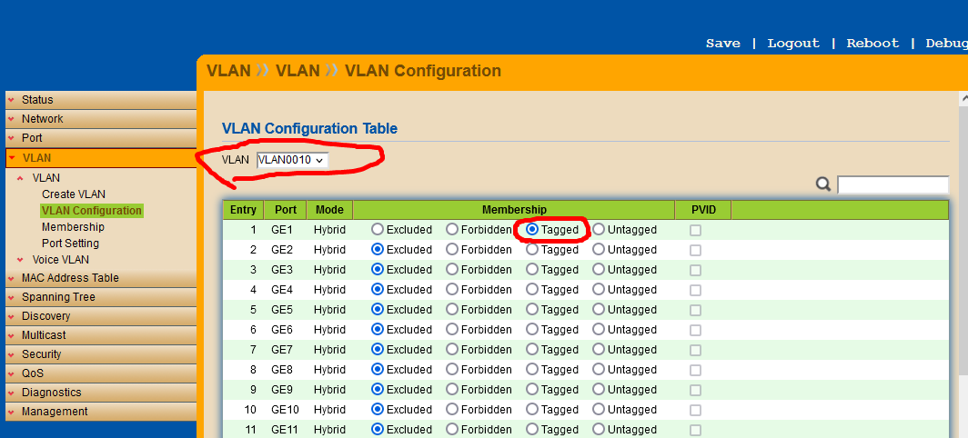 把要帶入 tag vlan id 10 的 port 都選到 Tagged