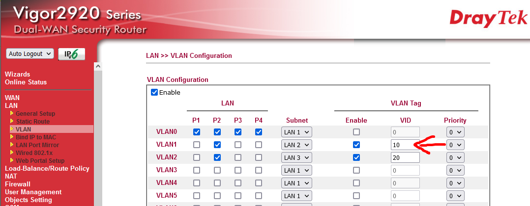 前端 Vigor Route 同一個 port 帶不同的 VLAN VID 過來