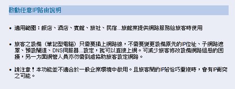 請注意!本功能並不適合於一般企業環境中啟用。且旅客間的IP若恰巧重複時,會有IP衝突之可能。