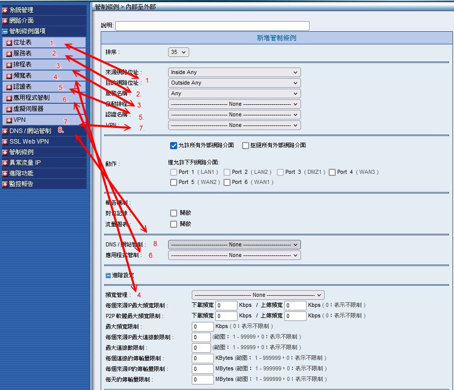 MHG NFW UTM 防火牆 管制條例 管制條例選項 對應位置