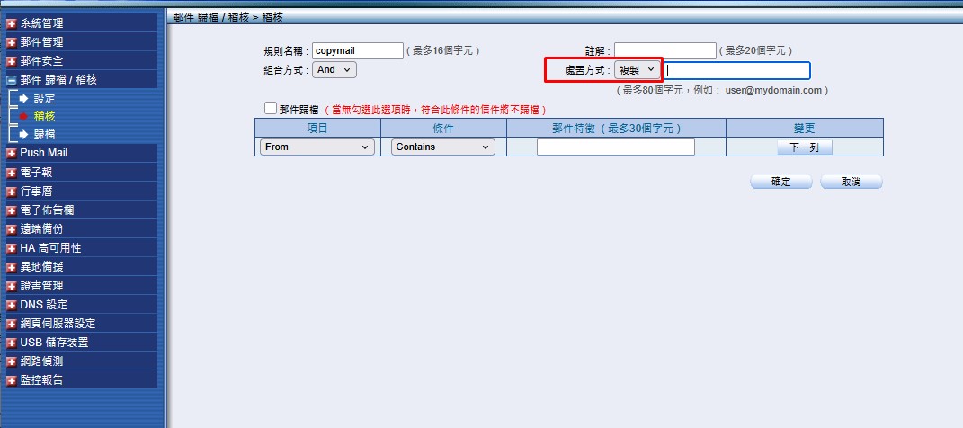 請問MAIL SERVER可否收到某人MAIL,同時公司其他MAIL設定也收到? NUSOFT 新軟系統 MLS Mail Server