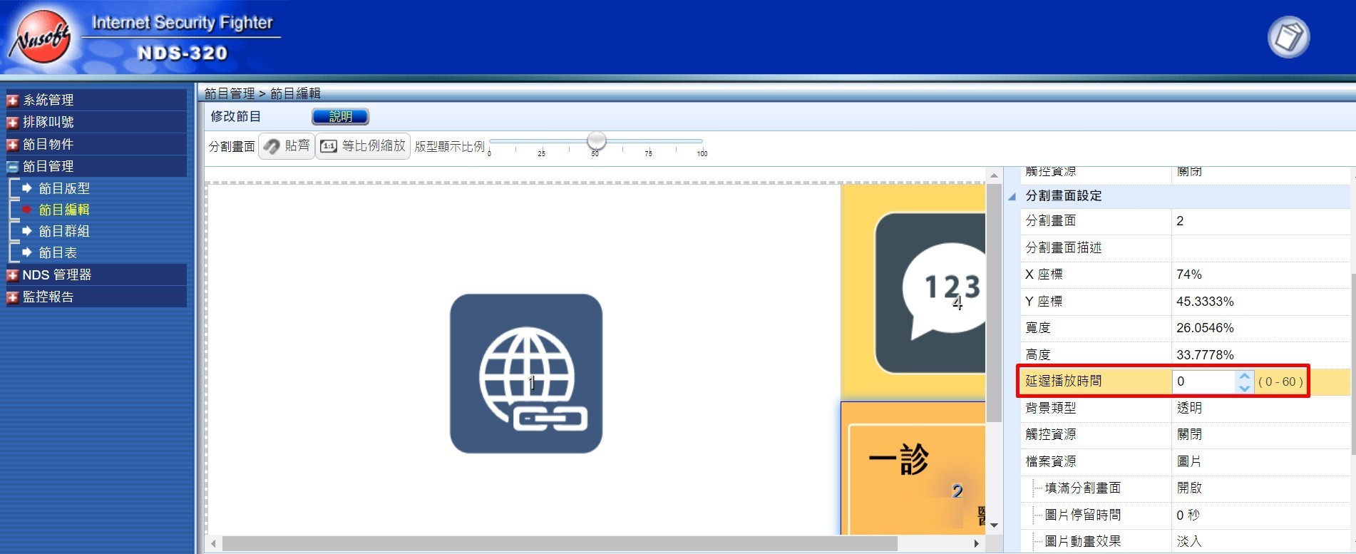 拼接式螢幕 NDS-300A 三拼 16:9 NUSOFT,調整「節目版型」內的「顯示器解析度」使用「自訂比例」。