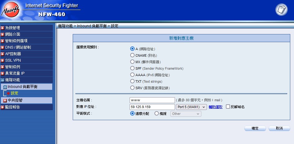 步驟 5. 平衡模式採用“循環分配”,按下【確定】鍵,完成WAN 1的A記錄建置。(mail.domain.com)