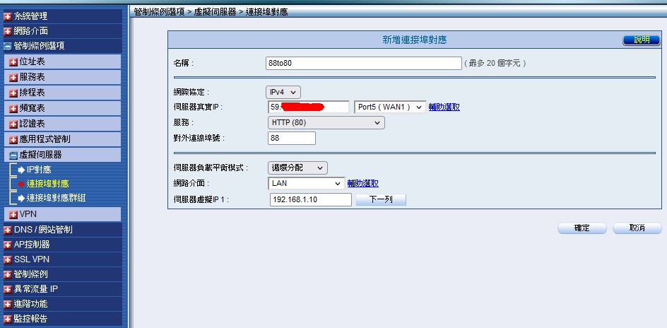 管制條例選項 > 虛擬伺服器 > 連接埠對應