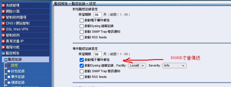 設定 事件日誌 傳送 email ,要等紀錄檔案滿 300KB 系統才會寄送。