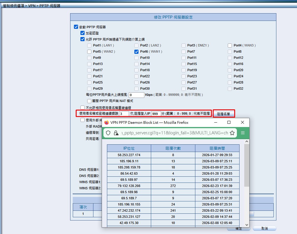 防火牆 PPTP L2TP VPN Server 防止盜用帳號機制 防止字典攻擊 Brute Force Protection BFP