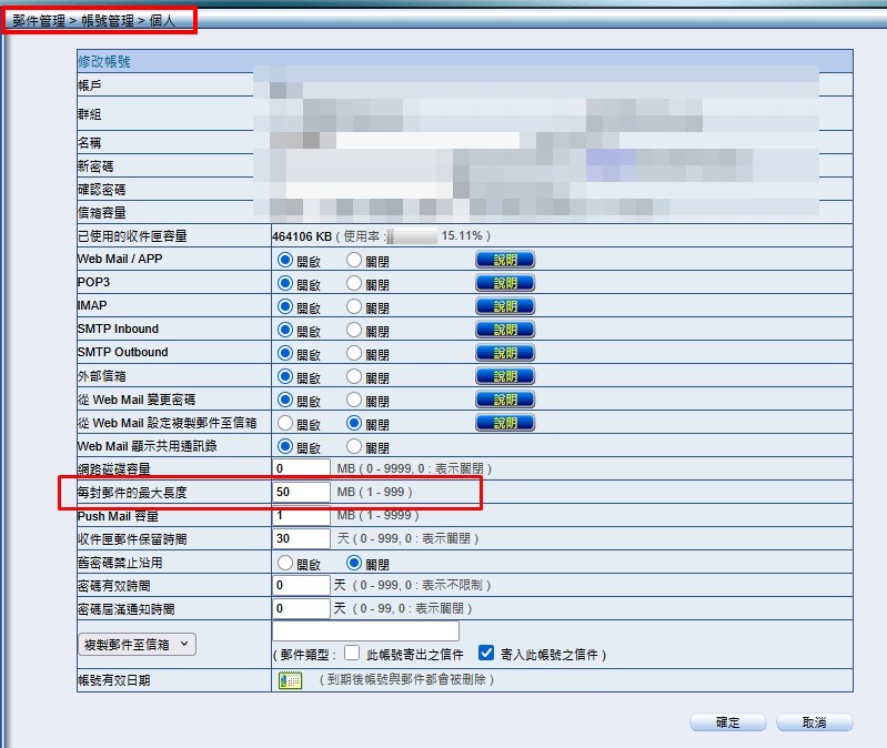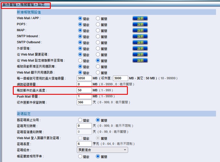 將超連結設定套用至 : 本機帳號寄發信件 本機帳號收取信件