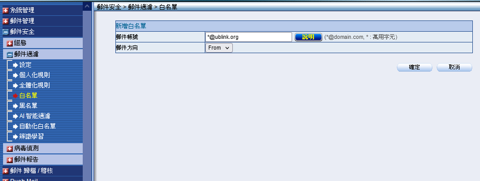 NUSOFT MLS ML 郵件安全 > 郵件過濾 > 白名單 Domain Mail address