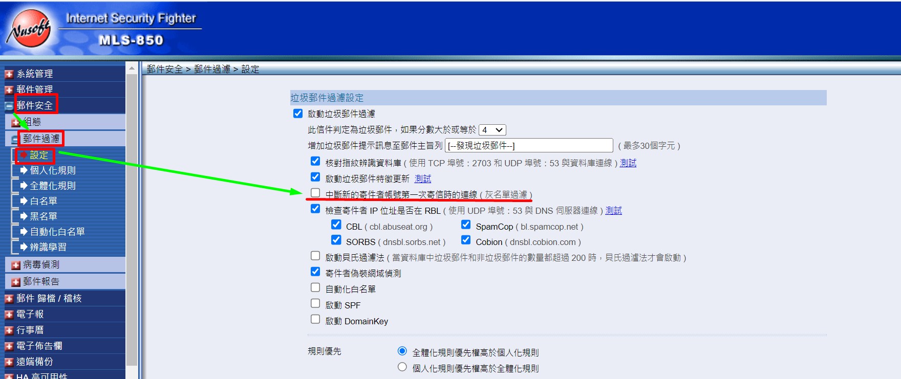 郵件安全 > 郵件過濾 > 設定
