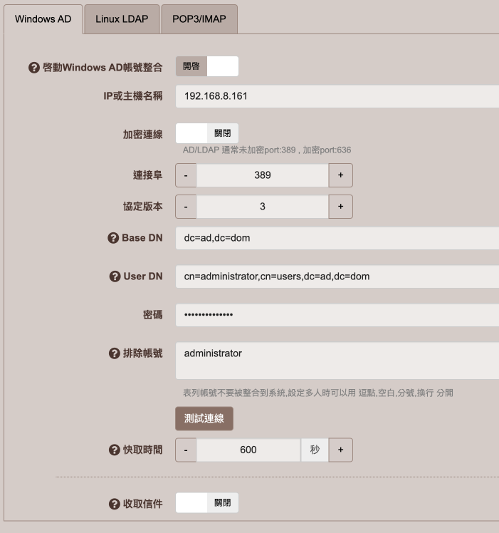 當原先的用戶使用AD的帳號與密碼登入本系統時 ,如果系統上尚未有該帳號時 , 系統會自動建立該帳號與密碼 , 登入動作包含 以 webmail登入或 pop3,pop3s,imap,imaps 登入方式