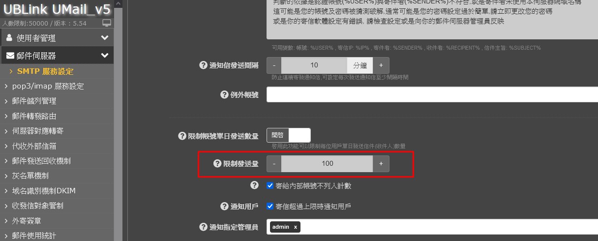 啓用此功能可以限制每位用戶單日發送信件(收件人)數量