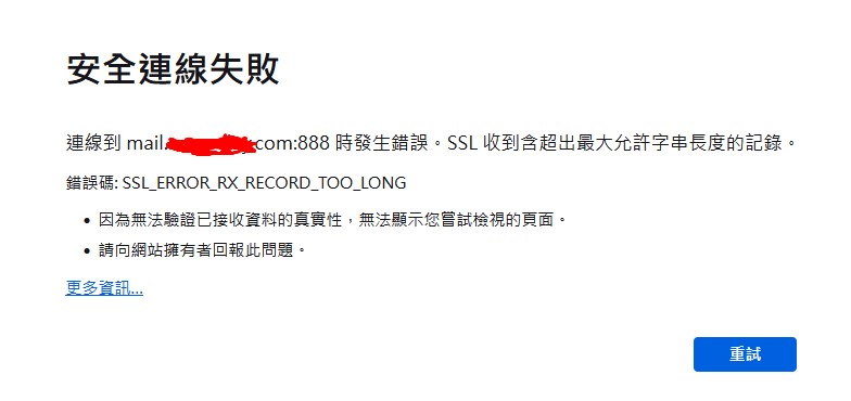 連線到 mail.test1.ublink.org:888 時發生錯誤。SSL 收到含超出最大允許字串長度的記錄。