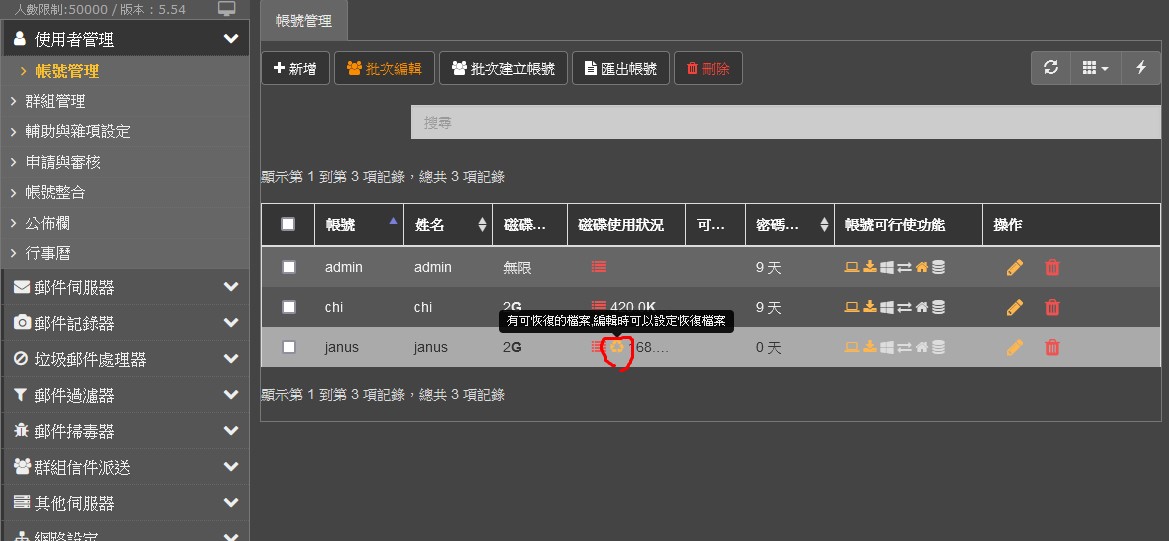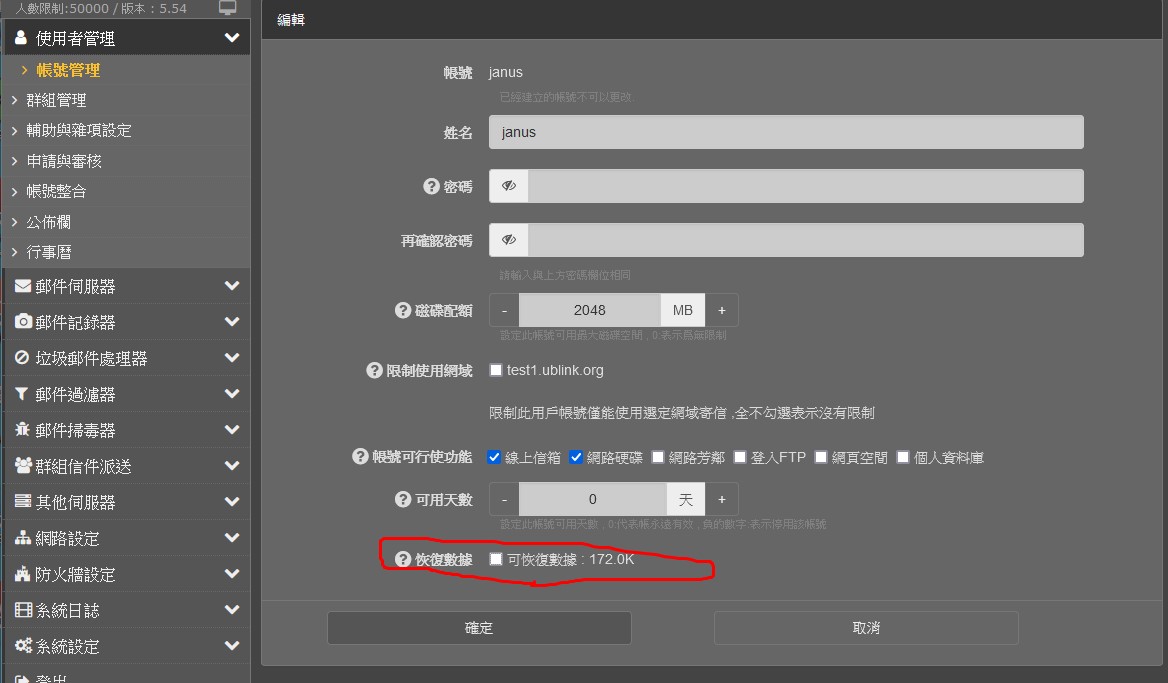 UMail 重建帳號 有可恢復的檔案 選單功能提示