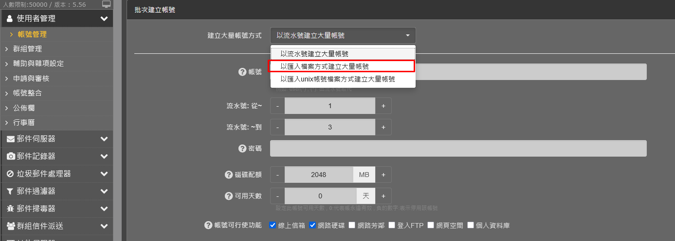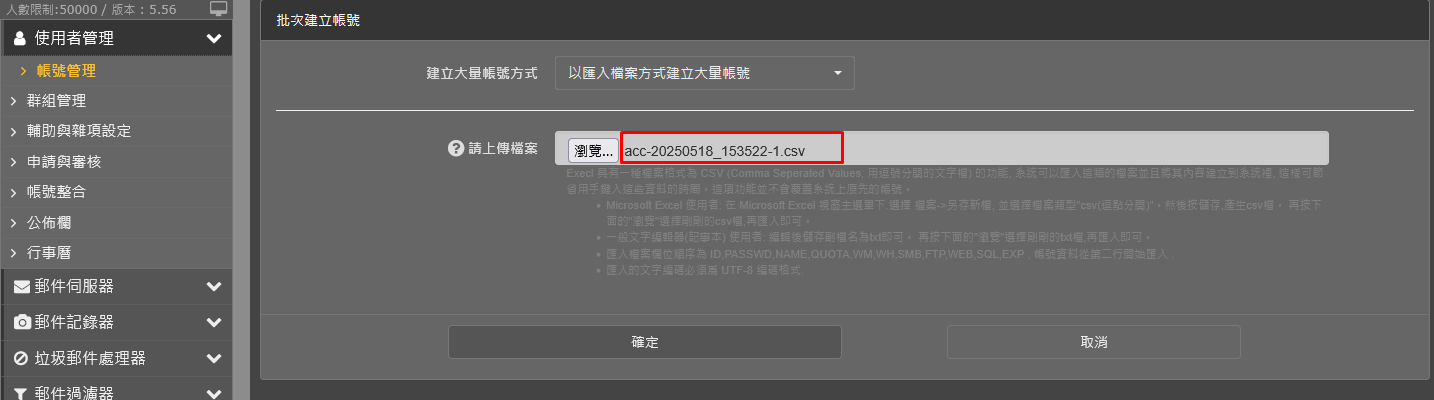 匯入檔案欄位順序為 ID,PASSWD,NAME,QUOTA,WM,WH,SMB,FTP,WEB,SQL,EXP , 帳號資料從第二行開始匯入 .