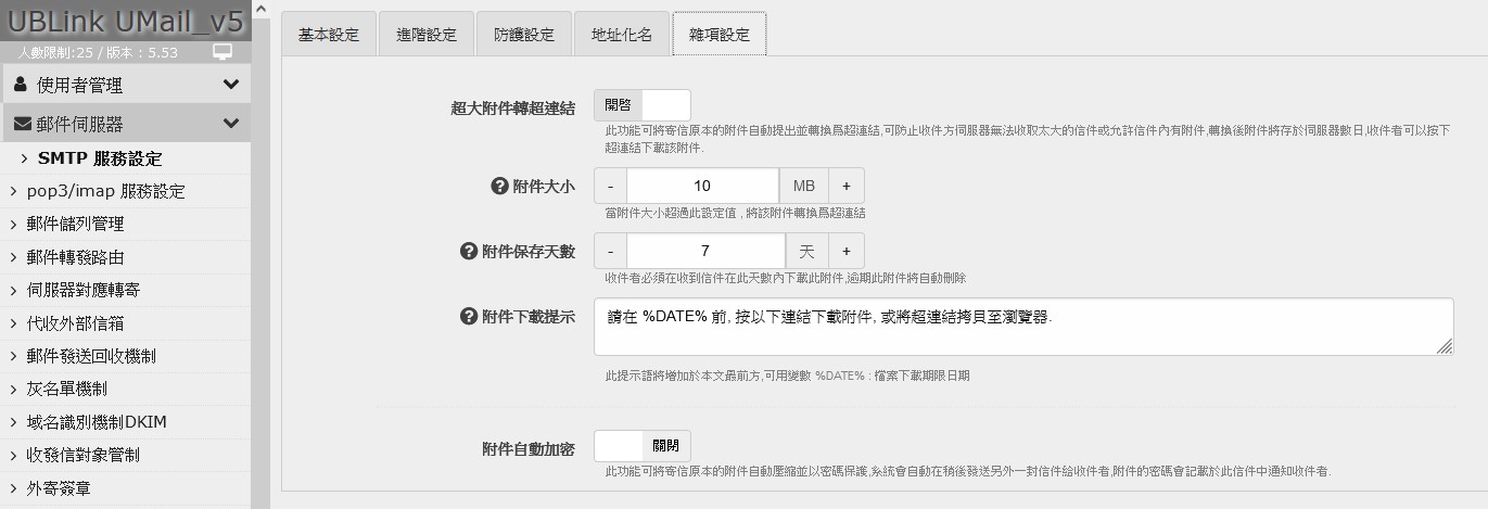 此功能可將寄信原本的附件自動提出並轉換爲超連結,可防止收件方伺服器無法收取太大的信件或允許信件內有附件,轉換後附件將存於伺服器數日,收件者可以按下超連結下載該附件.