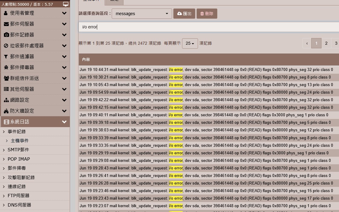 mail kernel: blk_update_request: i/o error, dev sda, sector 398461448 op 0x0:(READ) flags 0x80700 phys_seg 32 prio class 0