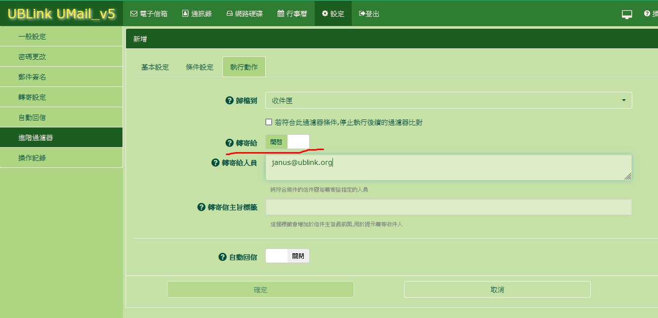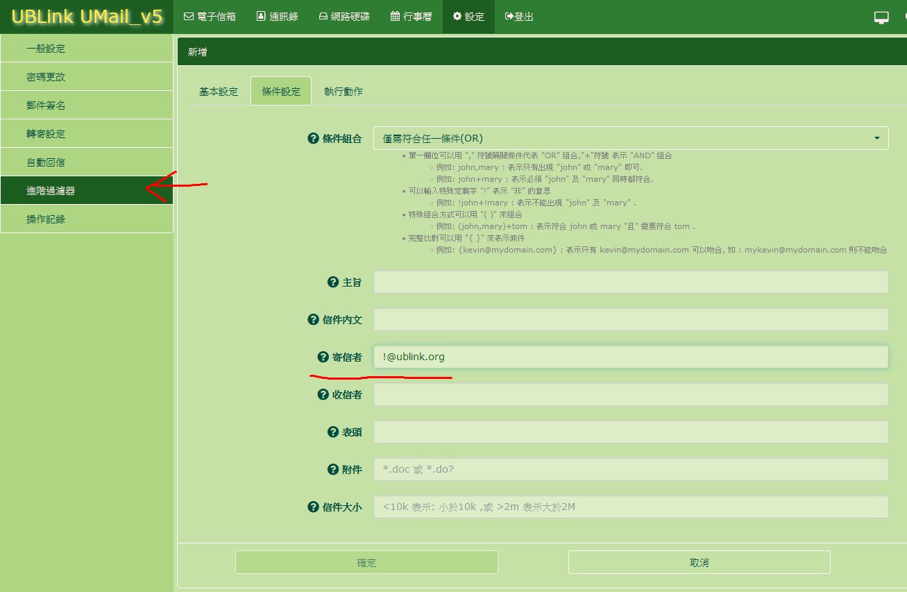 UMail v5 個人WebMail 進階過濾器設定轉寄信件不包含公司寄件者的信件,信件方向同郵件紀錄器