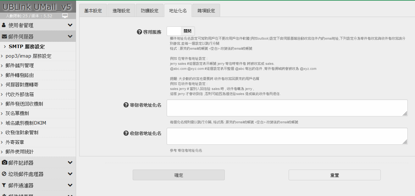 郵件地址化名設定可幫助用戶在不更改用戶信件軟體(例如outlook)設定下由伺服器端自動改寫信件內的emai地址,下列設定分為寄件者改寫與收件者改寫請分別書寫,並每一個設定以跳行分開