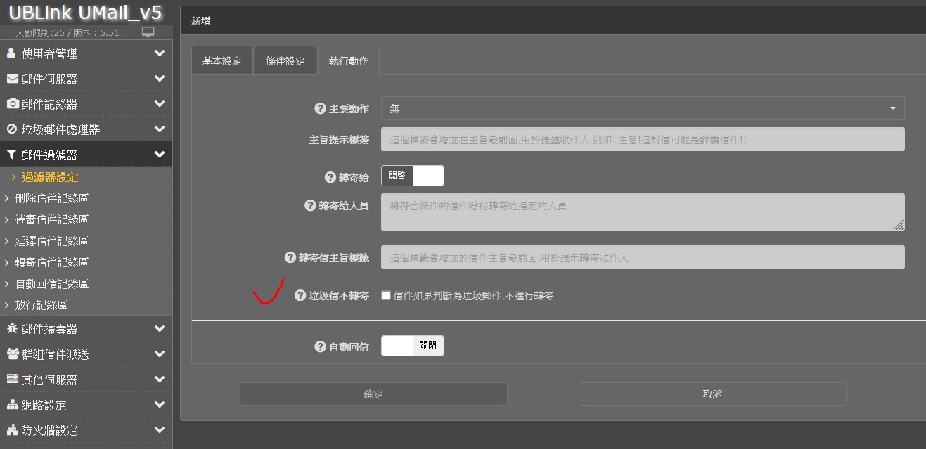 UMail v5 垃圾信不轉寄 信件如果判斷為垃圾郵件,不進行轉寄