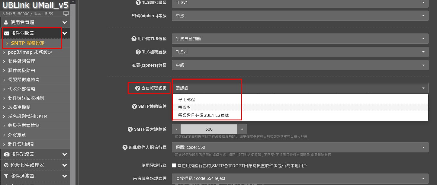 Nov 3 14:50:14 UMail 郵件伺服器/SMTP 服務設定: admin:[59.125.9.159] 修改設定 smtpd_sasl_auth:0->1