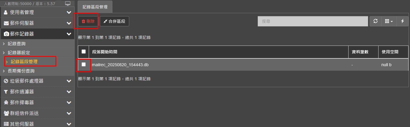 Aug 20 15:44:42 test1 郵件記錄器/記錄區段管理: admin:[192.168.254.27] 刪除