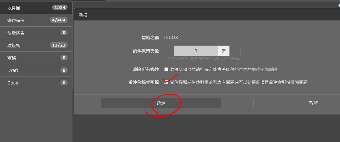 當信箱顯示信件數量或列表有問題時可以勾選此項目重建索引檔排除問題