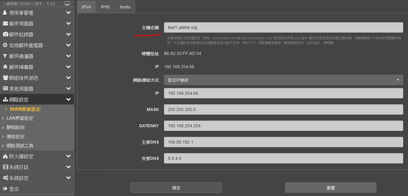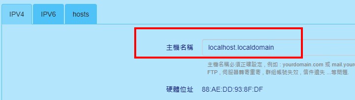 主機名稱必須正確設定 , 例如 : yourdomain.com 或 mail.yourdomain.com, 設定前請先用 ping 指令 確定你要指定的這個主機名稱 , 所解釋到的 IP 和你的伺服器IP相同 , 不正確的設定將會造成伺服器某些功能不正常 , 例如 FTP , 伺服器轉寄重寄 , 群組帳號失效 , 信件遺失 ...等問題.