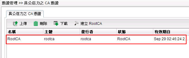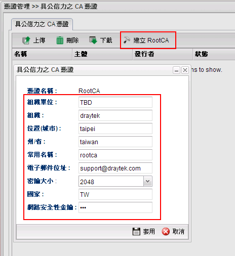 2. 點選「憑證管理 > 具公信力之CA憑證」,點選建立RootCA,並依序填入相關資訊,留意密鑰大小需更改為2048,並輸入一組安全性金鑰密碼,請記錄此頁面輸入資訊於步驟4需再填寫一次