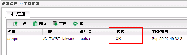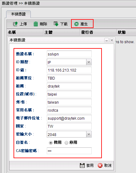 4. 點選「憑證管理 > 本機憑證」,點選產生,依序輸入相關資訊,留意ID類型選擇為IP,ID值填入2960 WAN端的外部IP位址,密鑰大小修改為2048,自簽名選擇為啟用,CA密鑰密碼輸入與步驟2相同的網路安全性