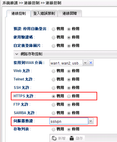 6. 點選「系統維護 > 連線控制」,啟用HTTPS允許,伺服器憑證選擇步驟5建立之設定檔