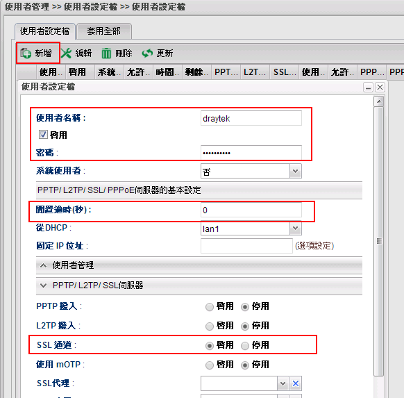 7. 建立使用者的VPN帳號,點選「使用者管理 > 使用者設定檔」,點選新增,輸入所要創建之使用者名稱和密碼並勾選啟用,閒置逾時修改為0秒,SSL通道設定為啟用