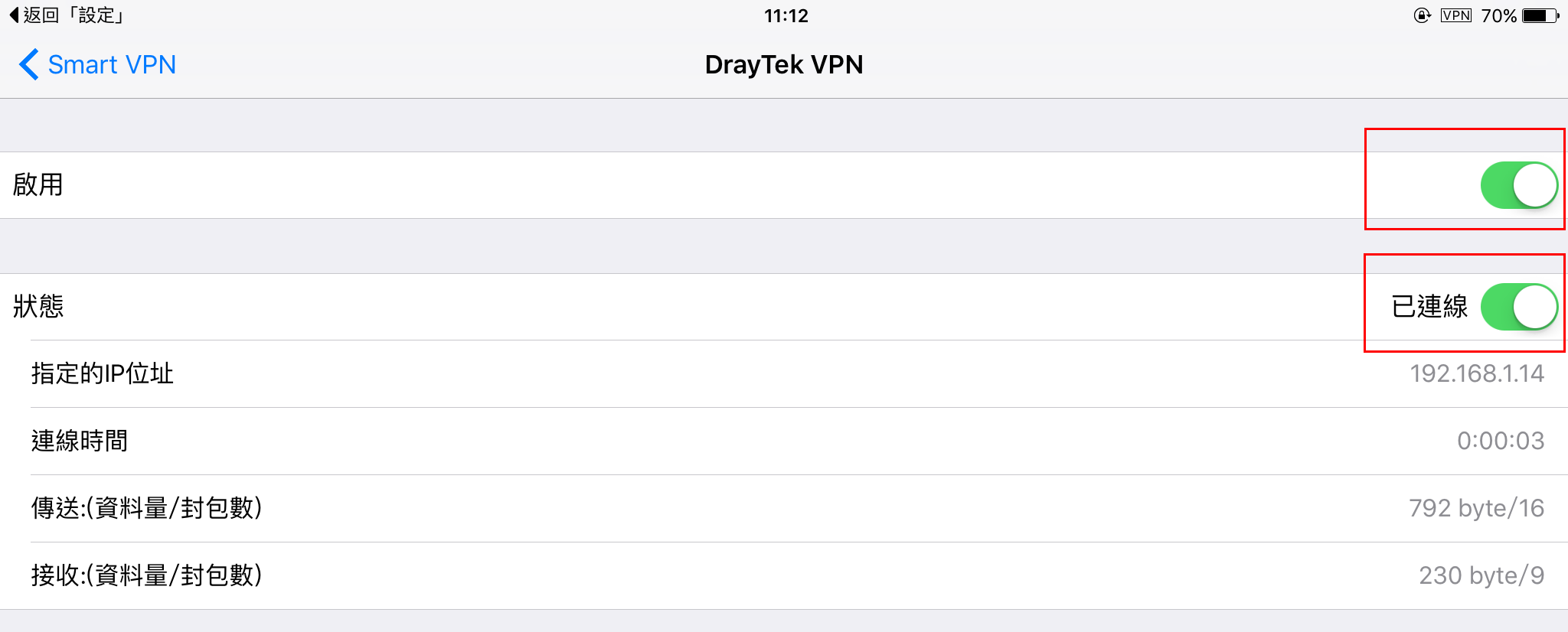 用和狀態兩個欄位向右滑動來啟用VPN連線,當成功連線後即在狀態列下方可看到先關的連線資訊