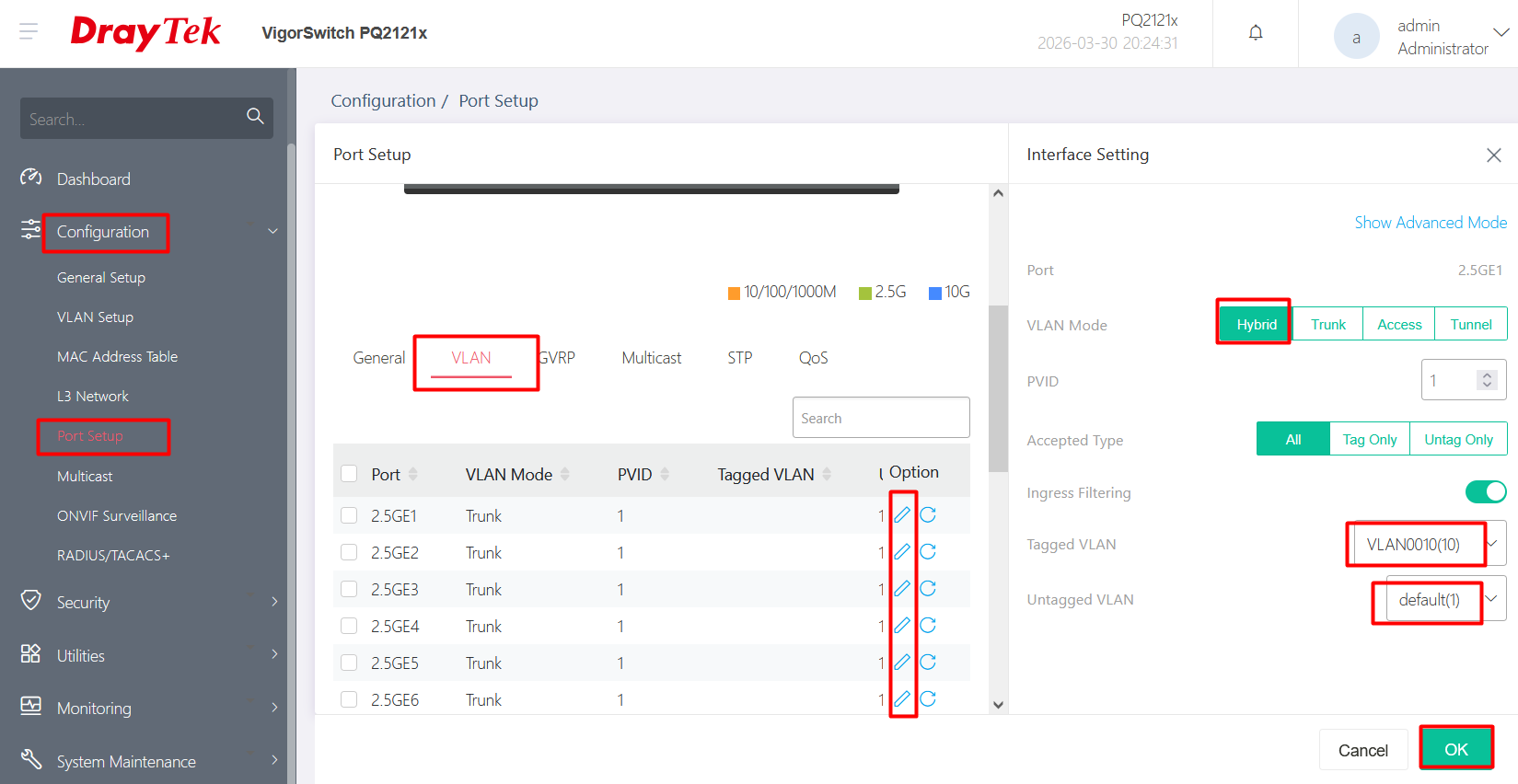 設定 每一個 Port 為 Hybrid Tagged VLAN VLAN10