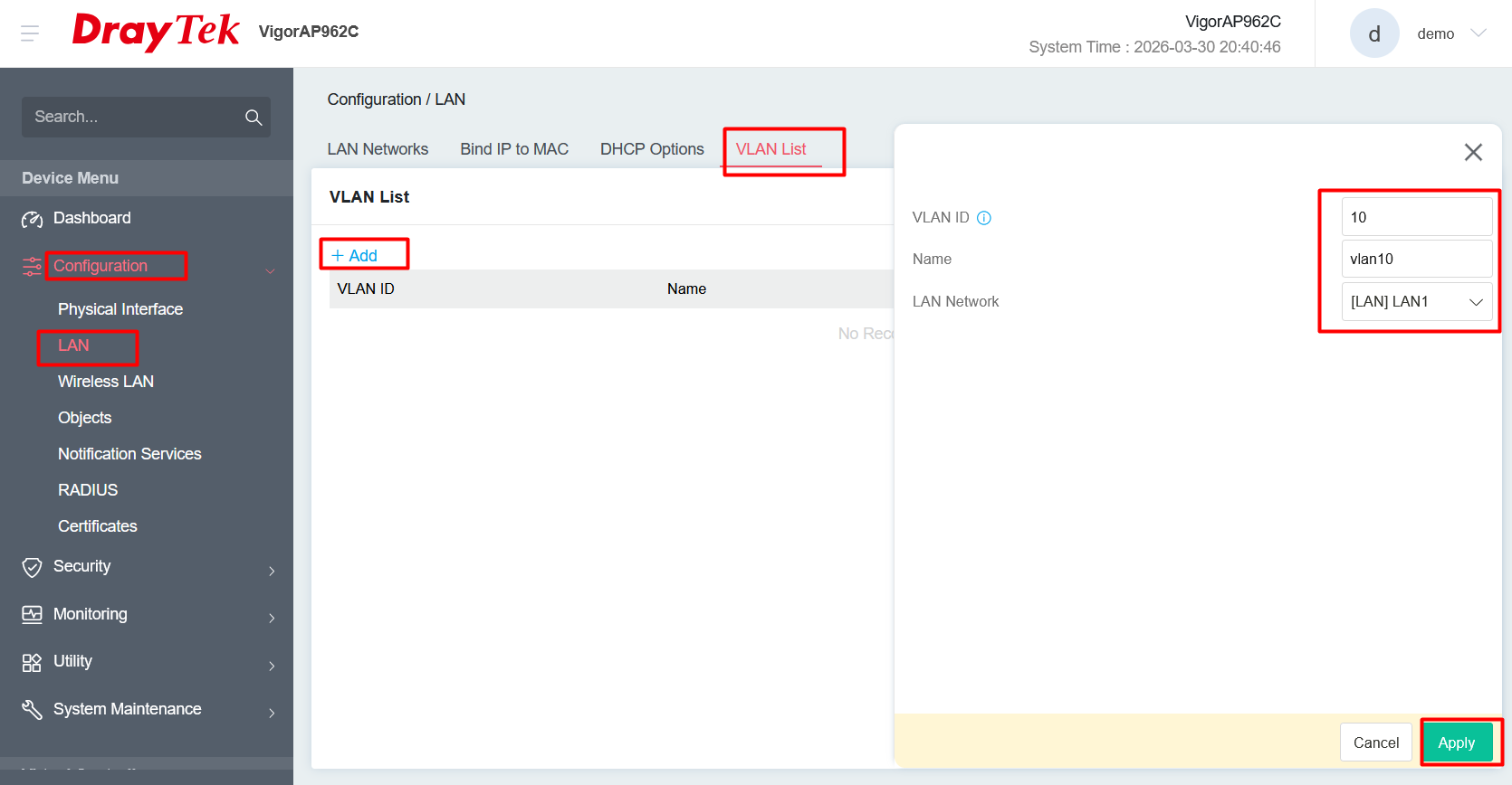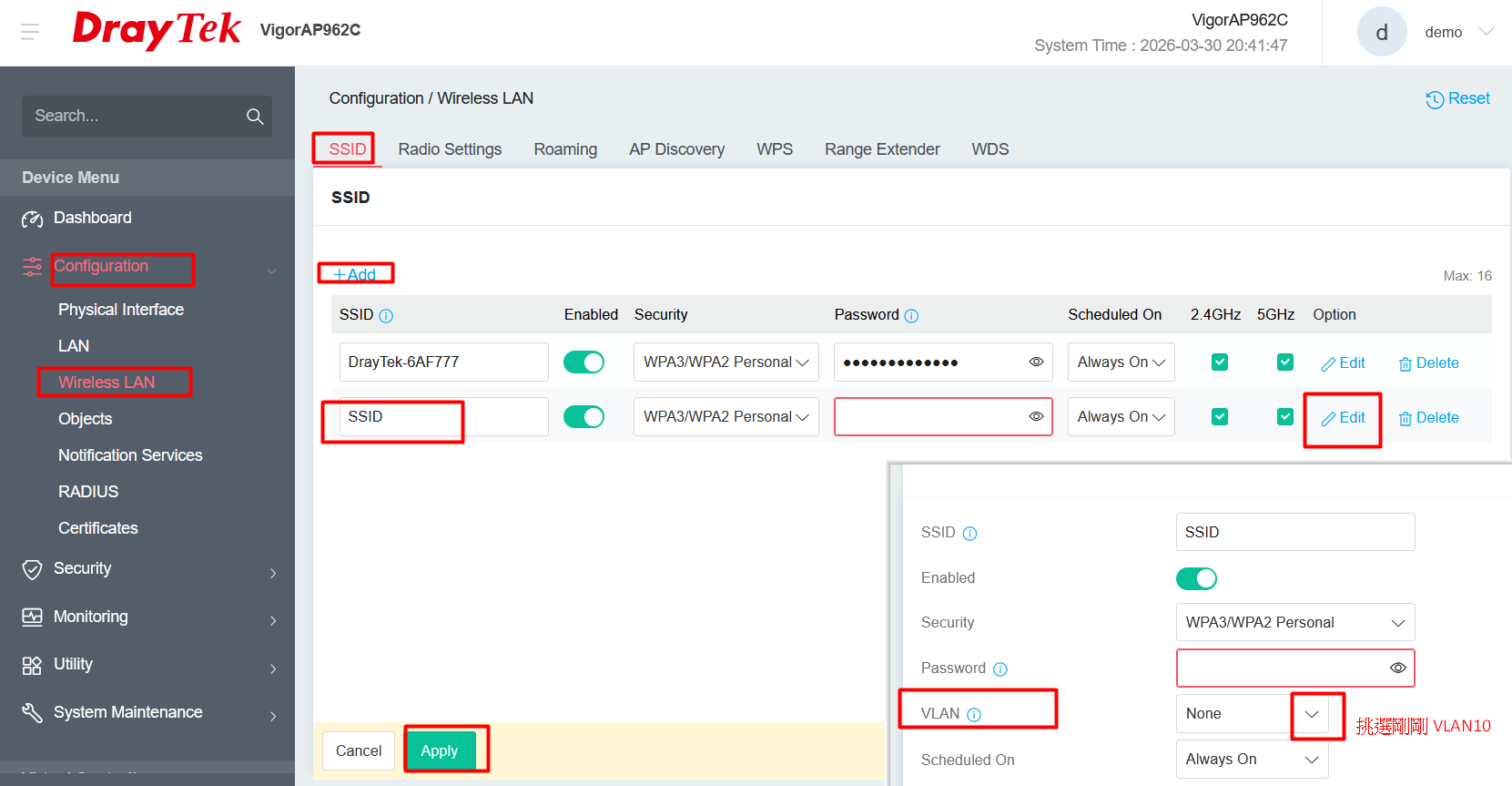 add SSID 2 為來賓使用 Edit VLAN ID 10