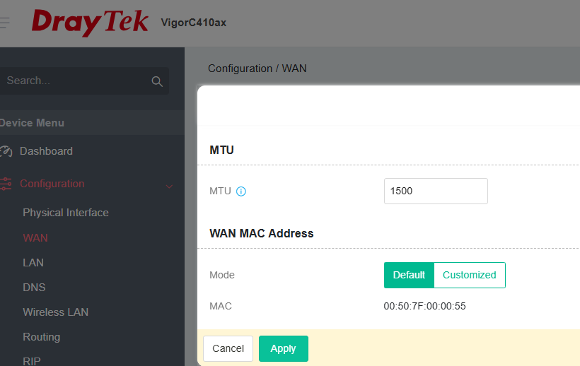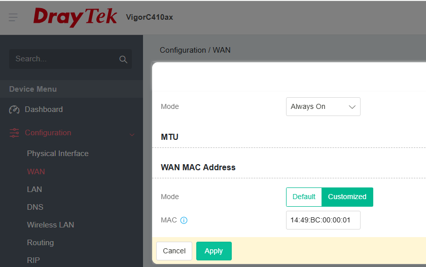 C410ax LTE 更改 WAN MAC Address,DrayOS5