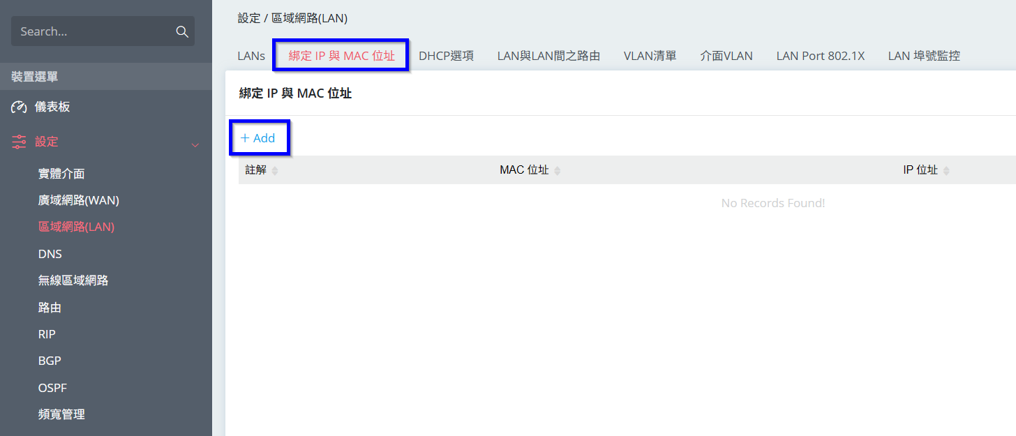 1. 登入路由器後點選[設定 > 區域網路 > 綁定IP與MAC位址],點選Add新增設定。