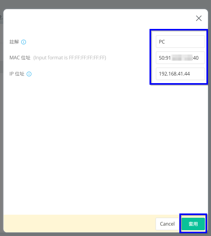 2. 輸入註解設定名稱,點選MAC/IP位址輸入視窗會自動列出偵測到的MAC/IP,若要綁定電腦不在清單內,可參考格式自行手動輸入,再點選套用設定。