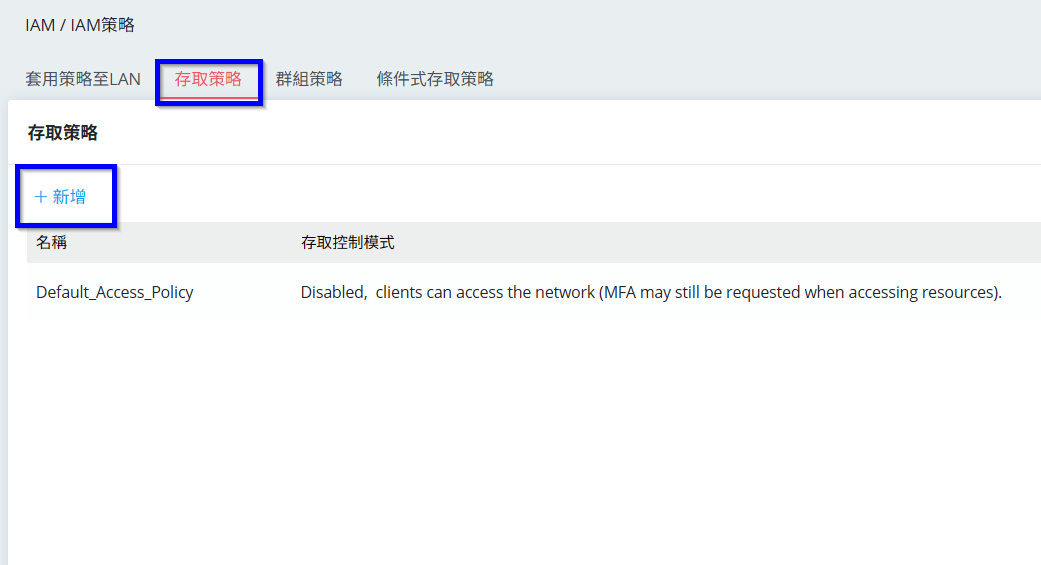 4. 延續一般綁定設定完成後 ,點選[IAM > IAM策略 > 存取策略],點選新增設定檔。