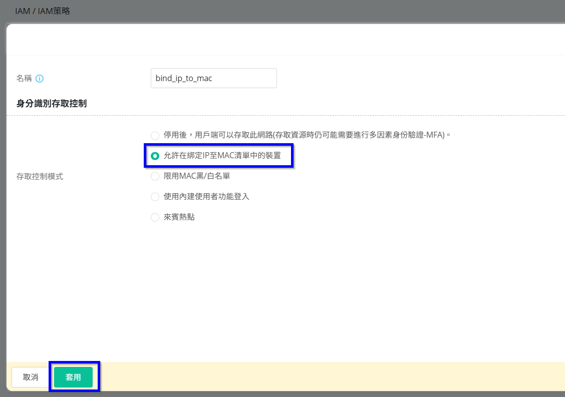 5. 填入設定檔名稱後,存取控制模式選擇為[允許在綁定IP至MAC清單中的裝置],再點選套用設定。