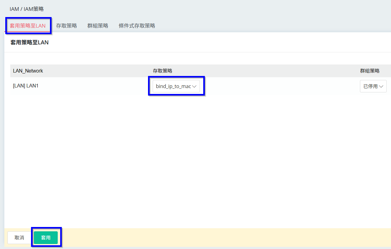 6. 點選[IAM > IAM策略 > 套用策略至LAN],將LAN1存取策略選擇為剛才新增的設定檔,最後再點選套用設定。