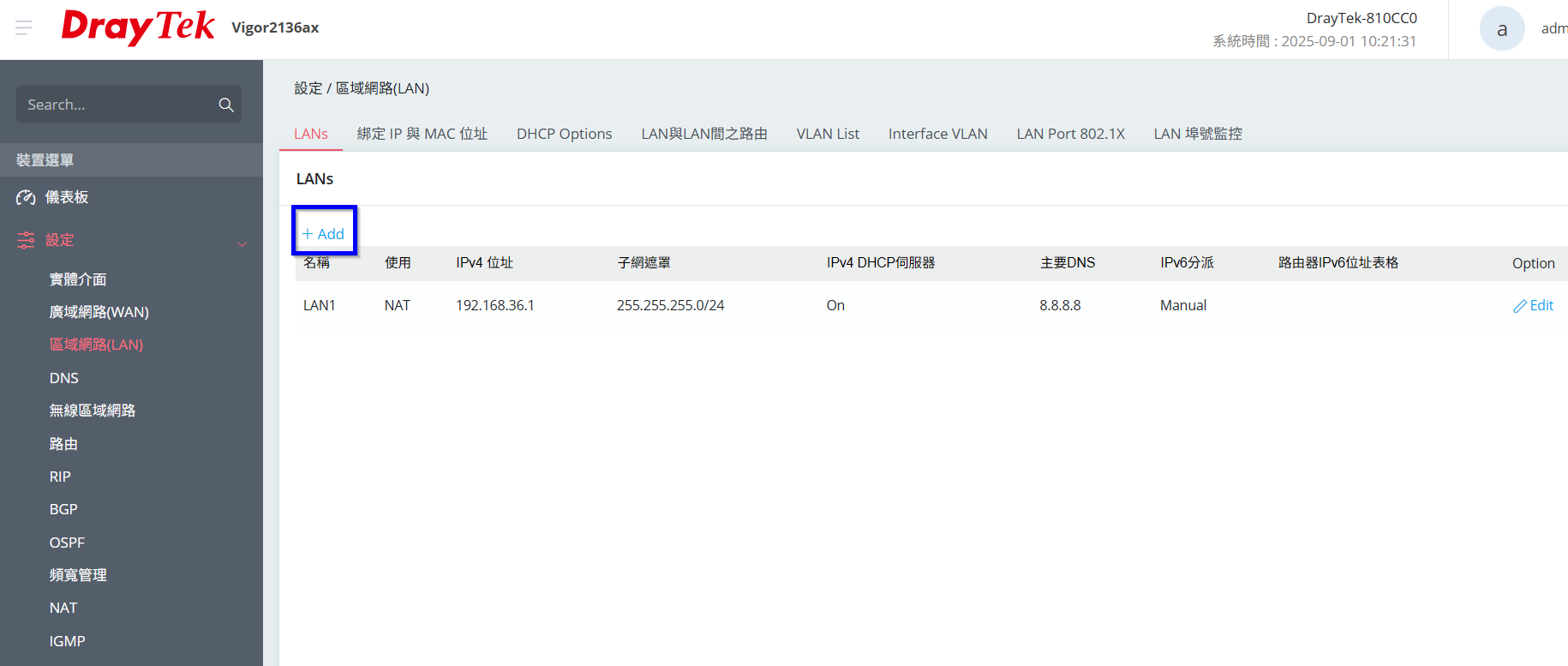 1. 登入Vigor2136ax後點選[ 設定 > 區域網路 ],點選Add新增另一獨立的訪客區網。