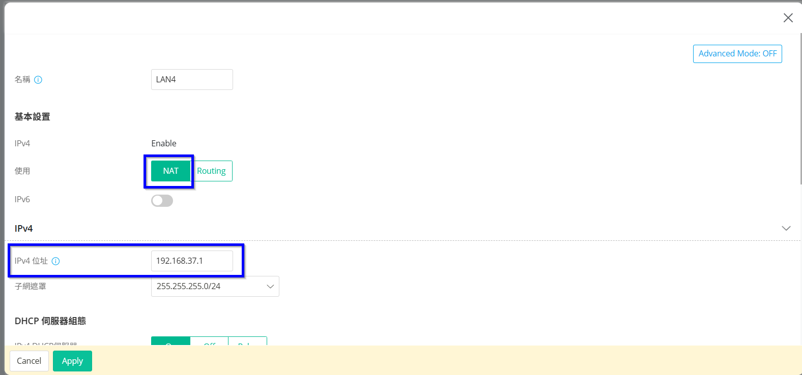 2. 選擇使用模式為NAT,IPv4位址輸入訪客網段的LAN IP,這邊填入192.168.37.1。
